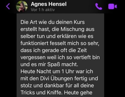 Die Möglichkeit, sowohl mit DIVI als auch mit Elementor zu arbeiten, und die umfassende Struktur des Kurses haben mich sofort angesprochen. Dass es zudem ein begleiteter Kurs ist, hat mich schlussendlich dann darin bestätigt, diesen Kurs zu buchen. In den Q&A Sessions konnten alle Fragen ausführlichst beantwortet werden und man selbst ist „am Ball“ geblieben. Dieser Kurs hat meine Erwartungen in jeder Hinsicht übertroffen und ich kann ihn uneingeschränkt weiterempfehlen.