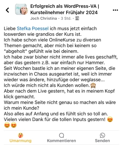 Stefka ist so eine herzensgute Seele, die sich so unfassbar viel Zeit für ihre Schützlinge nimmt. Es ist wirklich pure Freude mit ihr zusammen zu arbeiten. Man merkt einfach, wie wichtig es ihr ist, dass Jeder Fortschritte macht und durch ihren Kurs vorankommt. Ich hätte mir niemand besseren als Mentorin wünschen können und der Kurs deckt wirklich alles ab, um als WordPress VA selbstbewusst an den Start zugehen.